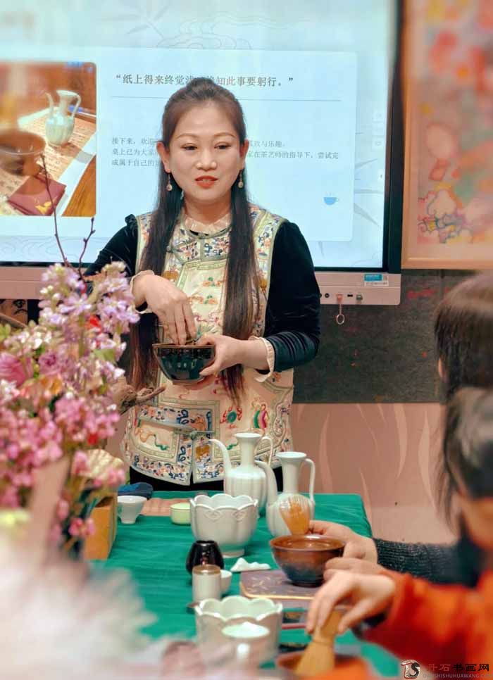 活动特邀竞秀区美术家协会副秘书长曹葳青现场授课,以理论讲解加实操体验相结合,带领大家沉浸式领略千年茶道之美。曹老师围绕宋代点茶的历史渊源、文化内涵与礼仪规范展开分享,详细解读“碾茶、罗茶、候汤、熁盏、调膏、点注、击拂”等核心工序,还原《大观茶论》所载宋式点茶精髓,让大家读懂“烧香、点茶、挂画、插花”宋人四雅的生活美学。